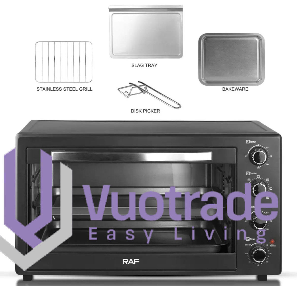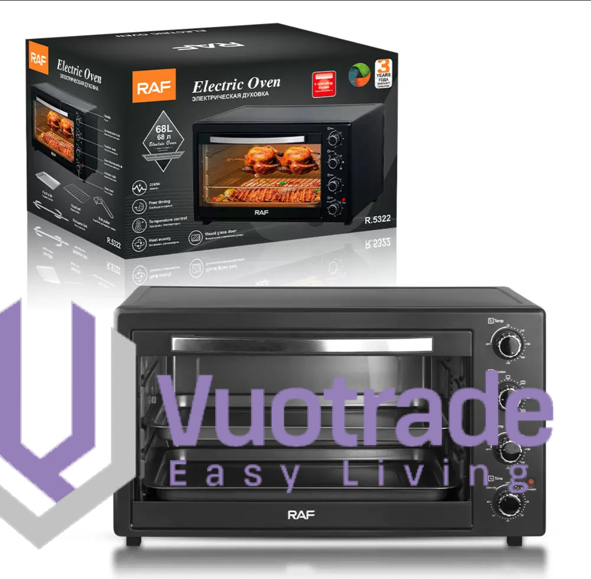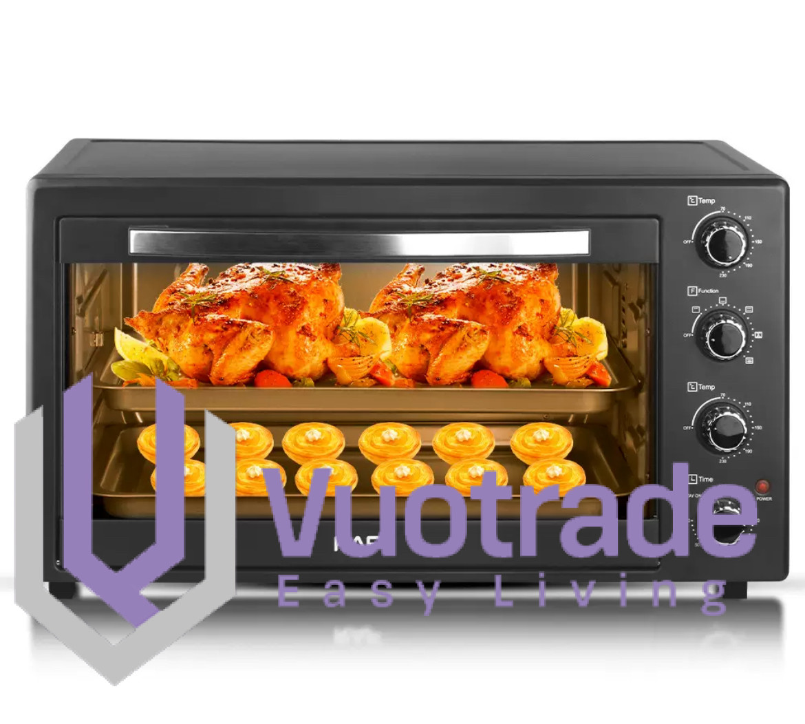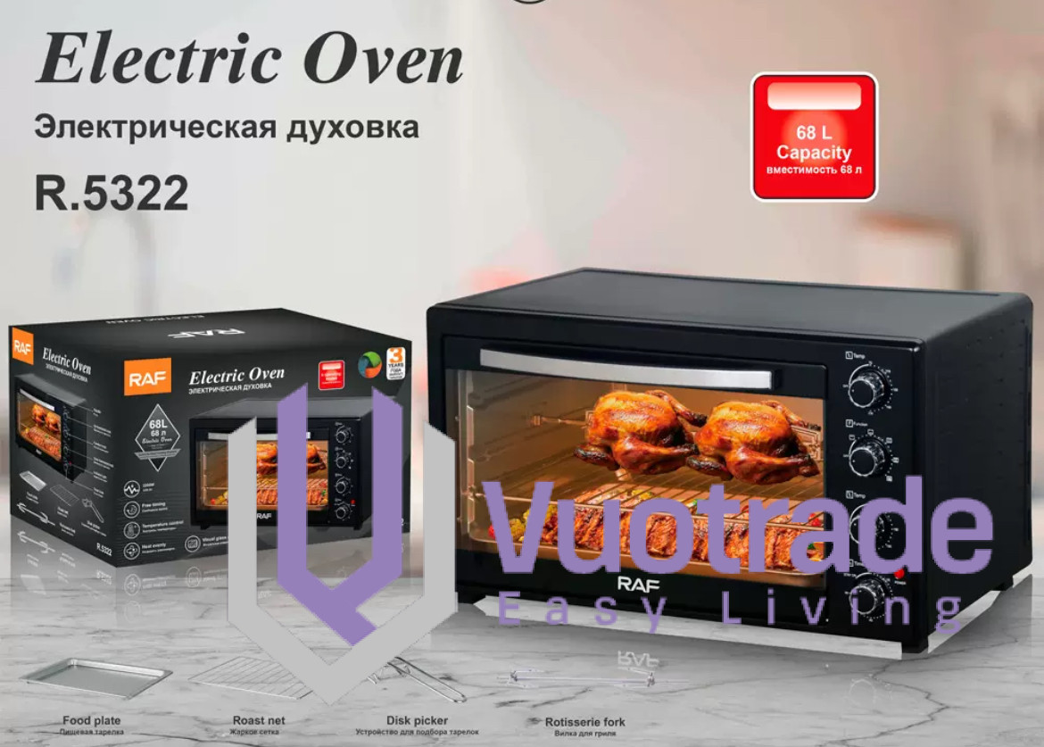 RAF 40 Litres Electric Oven - R.5310 Enjoy everyday meals with this Raf R5310 40 Litres Oven. Its multi-stage cooking facilitates you to use microwave oven.convection at the same time making your cooking experience memorable. The in-built memory stores the cooking levels simultaneously, thereby saving time and making cooking convenient. Key Features With 2 Hot Plates Temperature Control Visual Glass Door 1500 + 1600W +1000w + 600W Heat Evenly Dual burners for stovetop cooking Oven functions: baking, broiling, rotisserie and convection Full-range thermostat for flexibility 60-minute timer for accurate cooking times What’s in the box 1pc oven